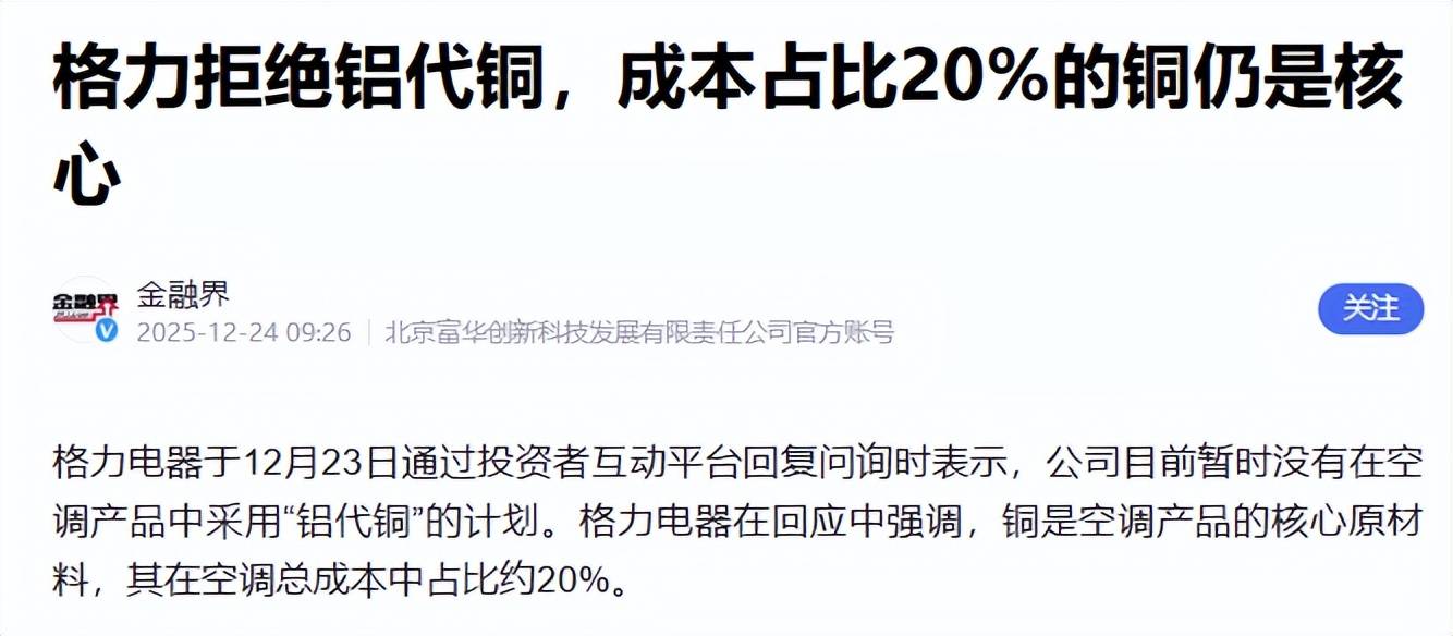 成果格力间接就没理睬这个茬,12月23日,格力何处间接给投资人回话了,说正在机能和质量不克不及完全的环境下,临时没有用铝取代铜的打算。